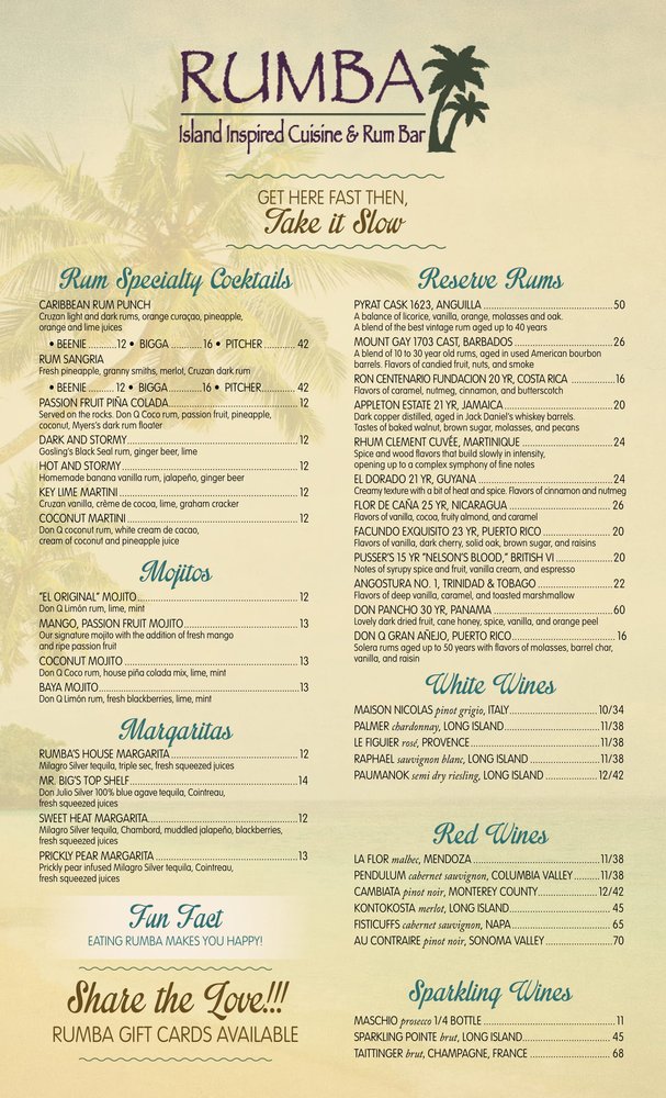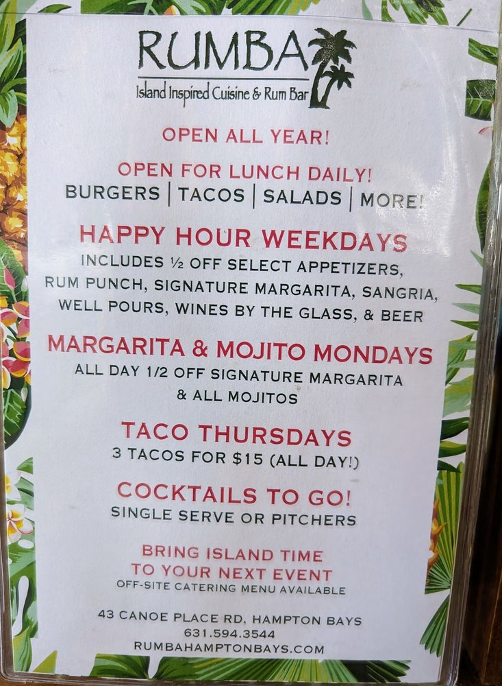 Rumba is a vibrant Caribbean-Mexican-seafood fusion restaurant located in Hampton Bays, NY. With a diverse menu featuring vegan and vegetarian options, this spot offers a lively ambiance with live music and waterfront views. Customers rave about the flavorful dishes, such as the coconut shrimp and Dominican ribs. The menu includes unique options like duck empanadas and soy-sugar cane salmon, all cooked to perfection. The rum flight and craft rum punch are popular drink choices. The friendly staff and charming atmosphere make Rumba a must-visit destination for a fun and delicious dining experience. Make sure to make a reservation in advance, as this hotspot gets busy quickly.